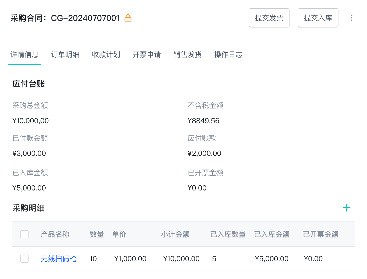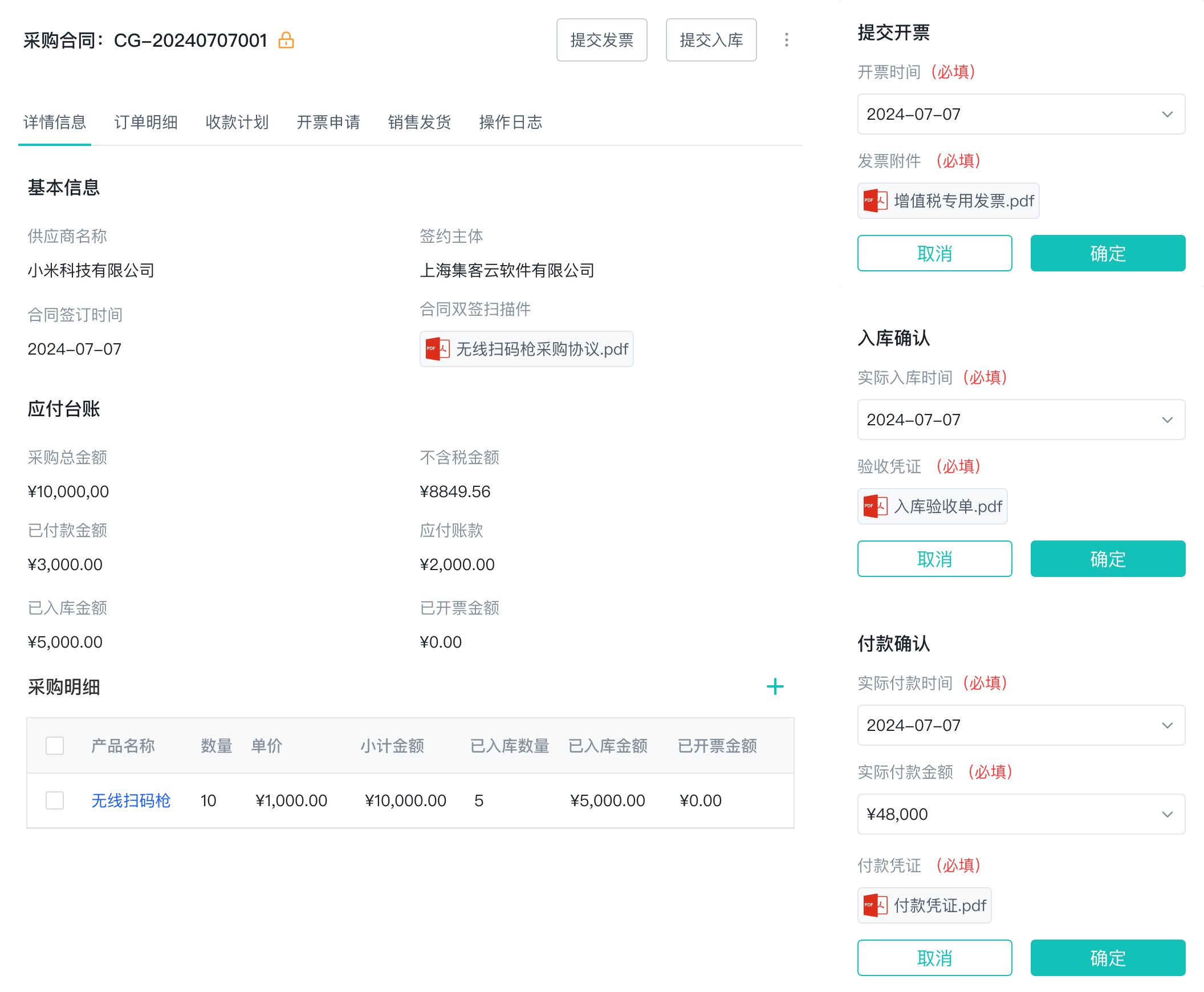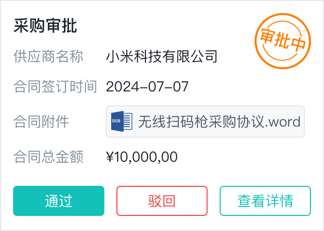 管理合同审批、签约归档、入库、付款等流程,一键下推采购入库、采购发票等子流程,自动生成合同应付台账。