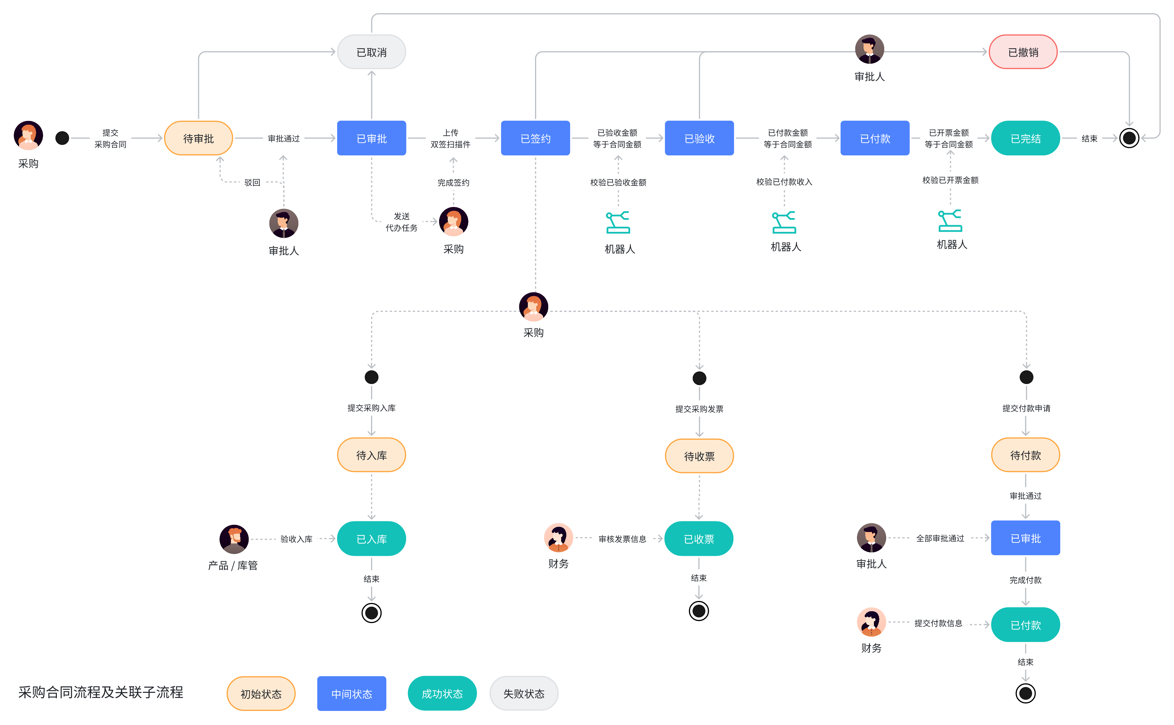 管理付款申请流程:采购发起付款申请 > 领导审批 > 财务确认付款 > 自动通知付款申请人